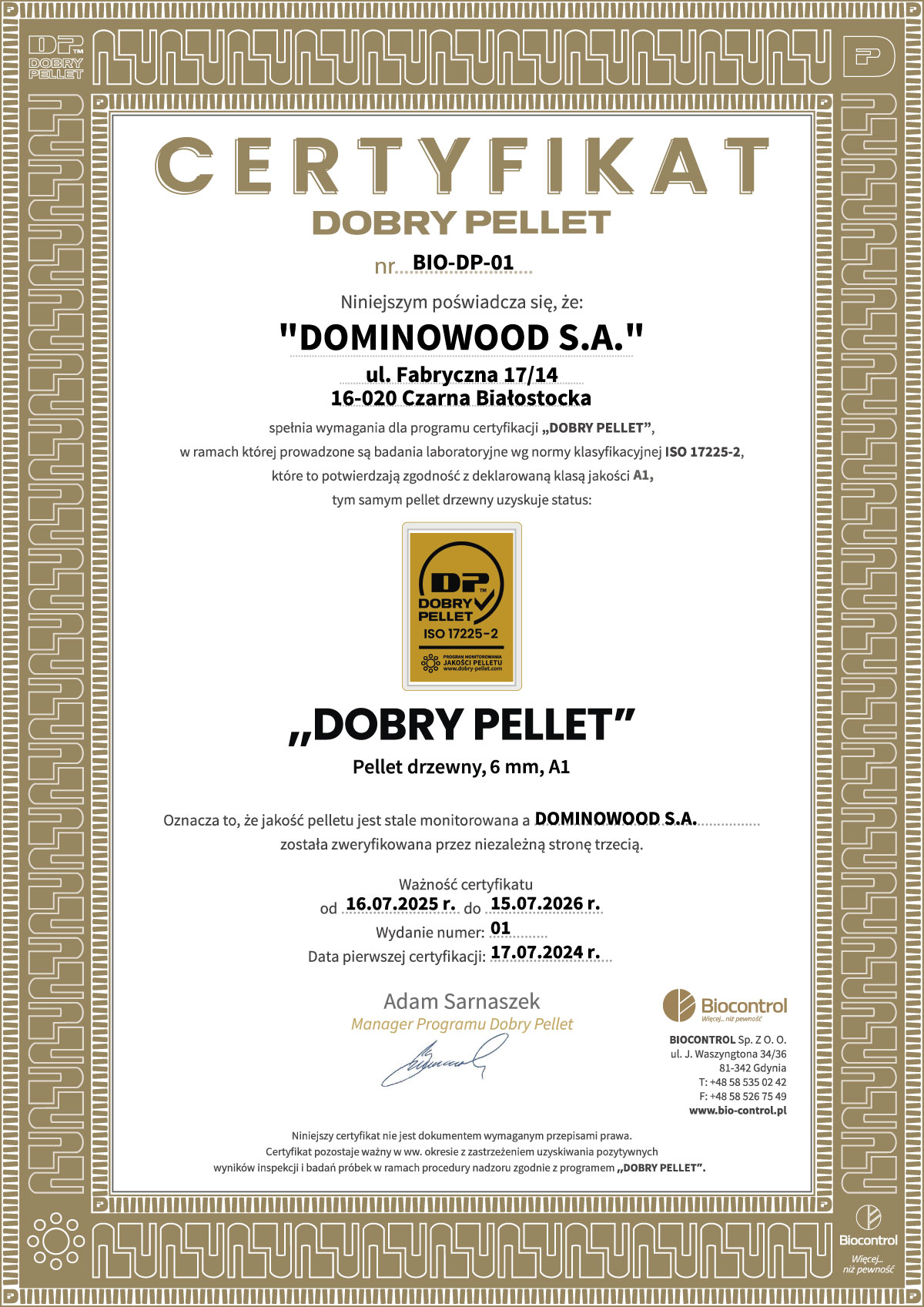 Abbiamo il piacere di informarvi che in data 30/11/2022 siamo stati la prima azienda in Polonia a ricevere il certificato “GOOD PELLET – PREMIUM GOLD”, a conferma della massima qualità del pellet da noi prodotto.